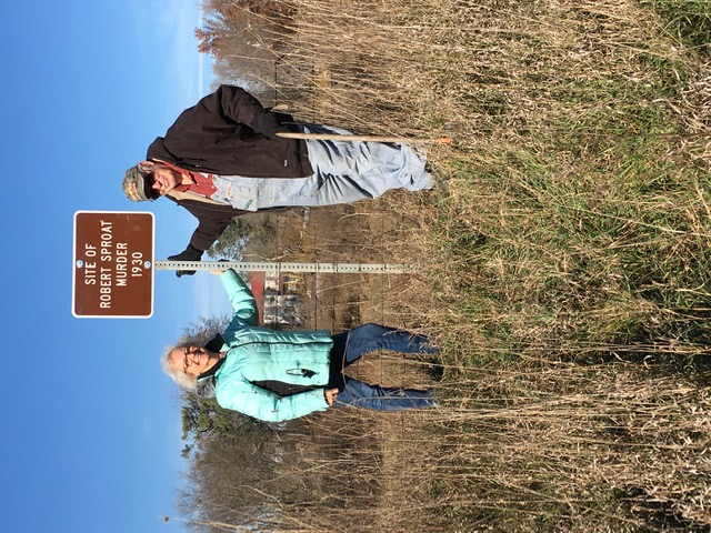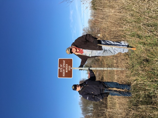 On Tuesday November 23,2021, Denny Dykstra, Daisy Wingert, (another board member of the Cedar County Friends of Historic Preservation) and I, Cedar County Sheriff Keith L. Whitlatch, retired, went out to the location where the car stop was made and where Robert (Bob) Sproat was murdered. We had a sign placed in the fence line on the north side of the road marking where the murder took place.